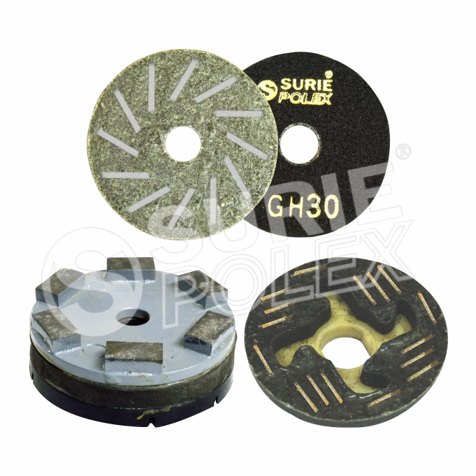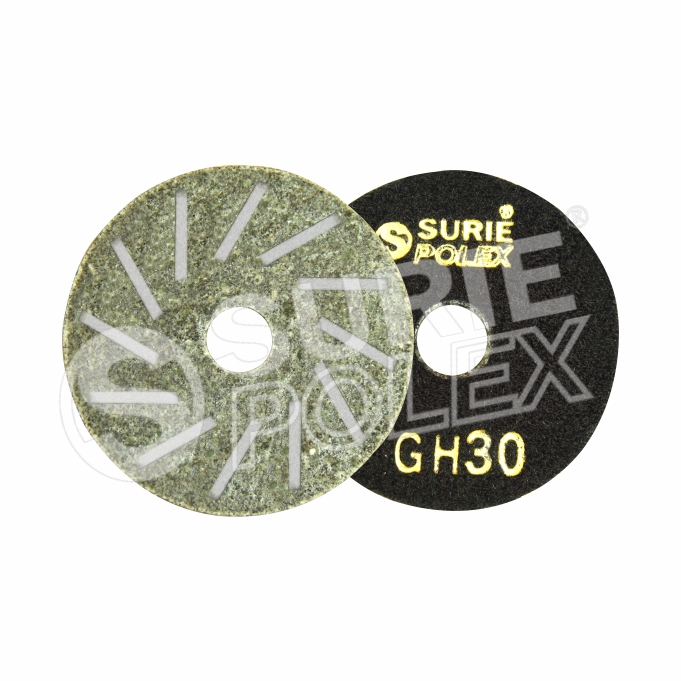 This chamfering diamond abrasive contains 3, 4, 5, 6, 8, 9, 12 metal bond segments and is used for coarse grinding. It has both fitting as our CRB abrasives Snail Lock and Velcro Back can fit easily onto a hand polisher. It is available in these grits; - 60, 100, 150, 200, 240, 270, 400, 600 and 800.