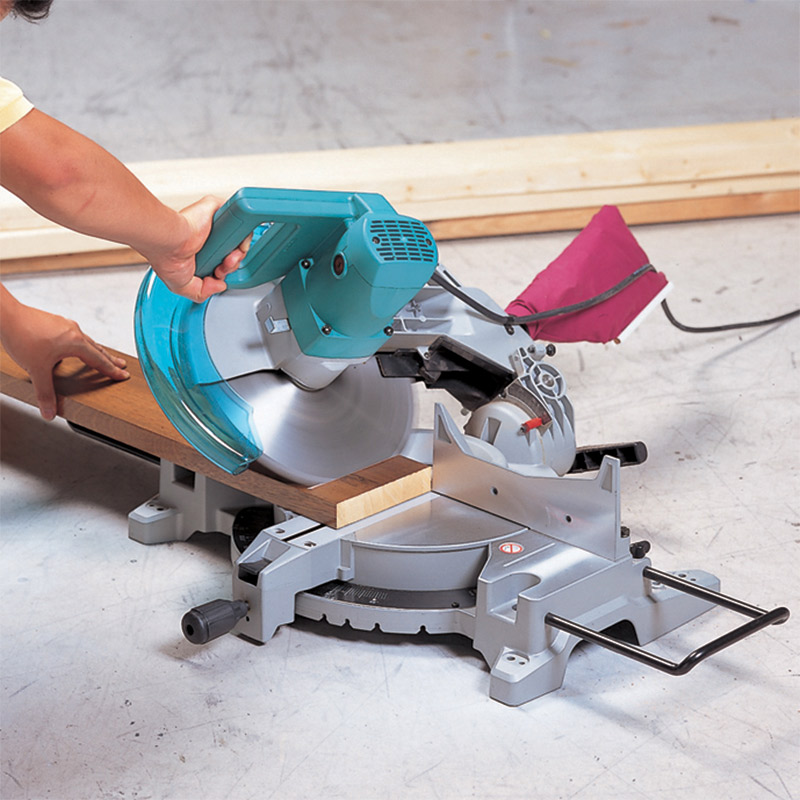 - 115 mm (4-1/2″) tall pivoting fence for cutting up to 140 mm (5-1/2″) crown molding